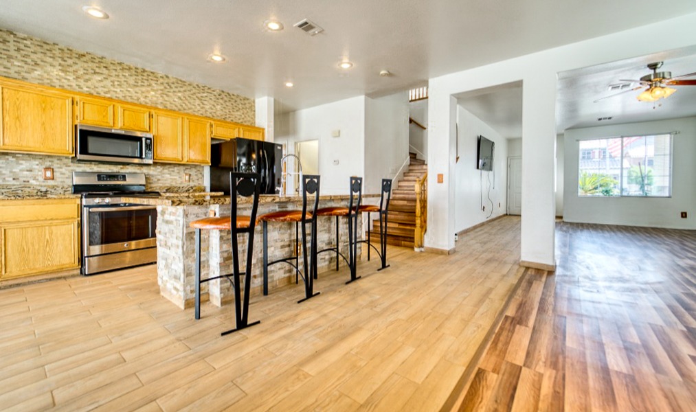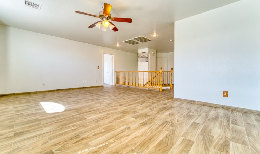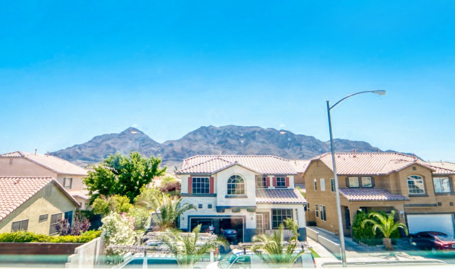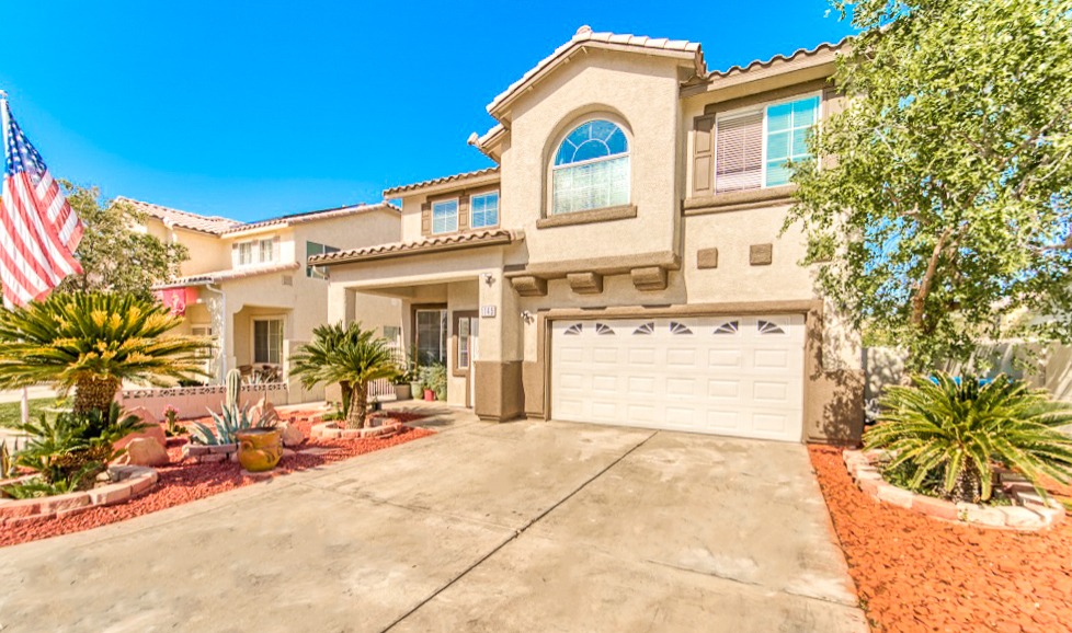 Featuring a large driveway and two-car garage along with a spacious, cemented backyard, this two-story residence has plenty of outdoor space. The covered patio offers comforting shade from the Vegas sunlight and the upper story displays a large loft with a glorious mountain view.