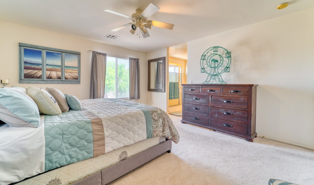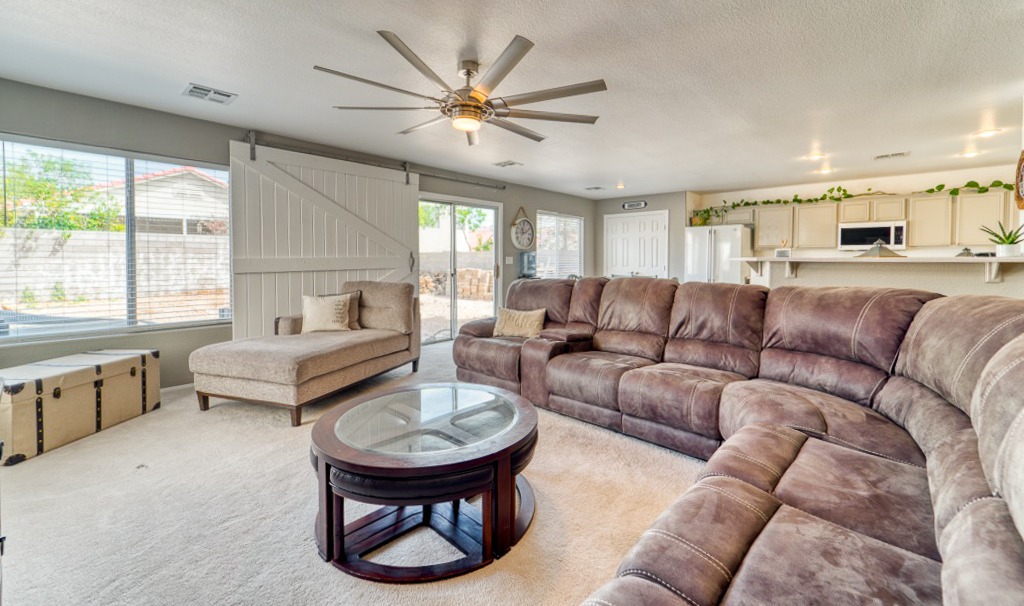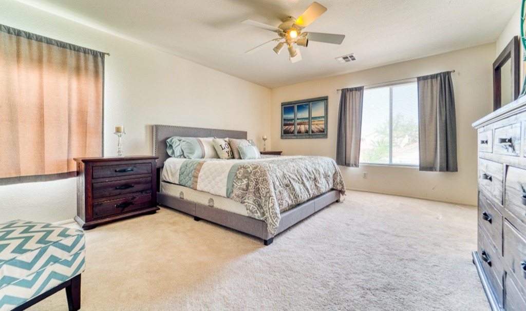 Located in northwest Las Vegas, this beautiful home brags of new, upgraded floors and bathroom and kitchen. Upon entrance you are welcomed with a large family room and loft, both featuring more than enough space to make your own. With a walk-in closet accessible from the master bedroom and two full